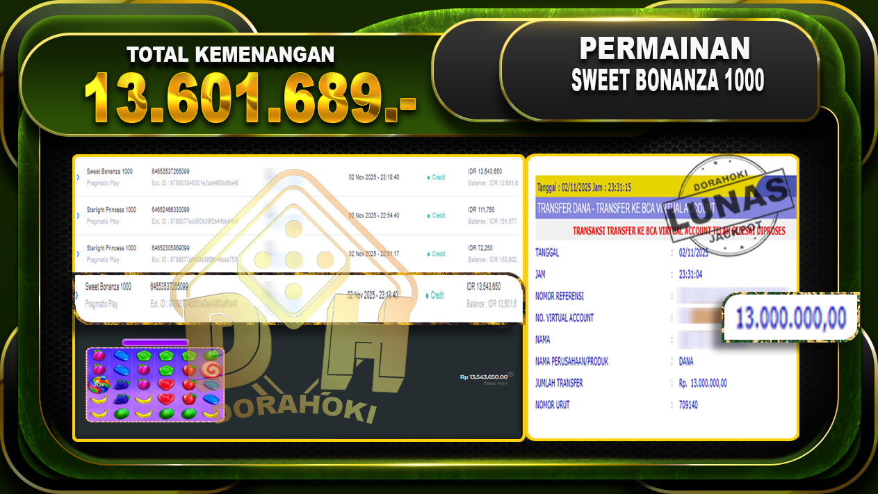 Bukti JP Sweet Bonanza 1000 – ucapkan selamat kepada user id apix atas kemenangan di Sweet Bonanza 1000 dengan total kemenangan Rp.13.601.689,- Yang pasti nya langsung LUNAS sesuai bukti ya bosku. Dorahoki nih bosku berapapun akan tetap kami bayar lunas ya bosku.