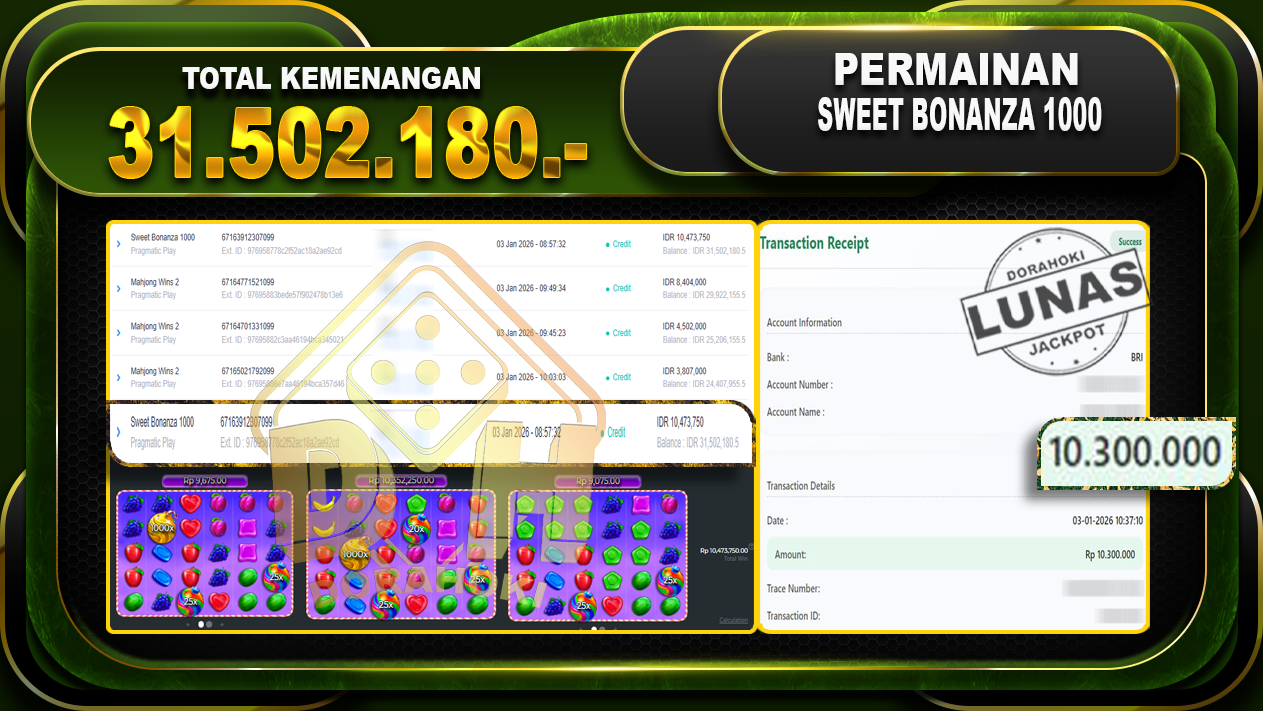 Bukti JP Sweet Bonanza 1000 – ucapkan selamat kepada user id xadx atas kemenangan di Sweet Bonanza 1000 dengan total kemenangan Rp.31.502.180,- Yang pasti nya langsung LUNAS sesuai bukti ya bosku. Dorahoki nih bosku berapapun akan tetap kami bayar lunas ya bosku.