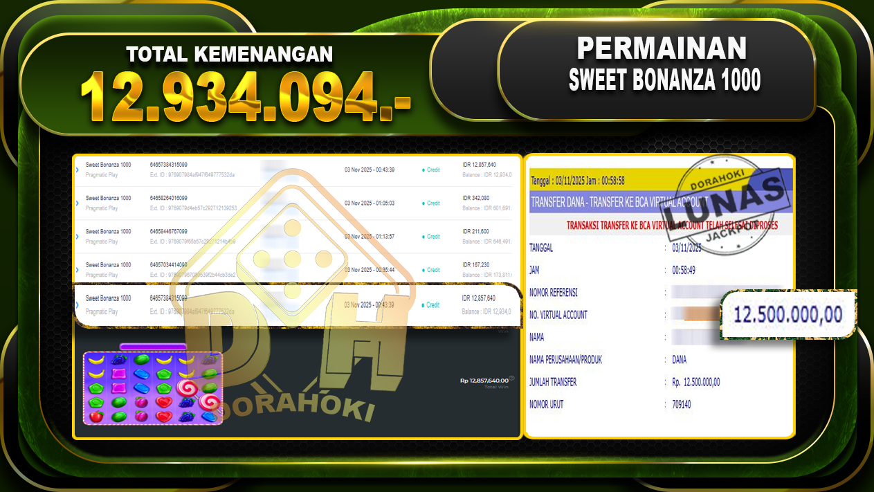 Bukti JP Sweet Bonanza 1000 – ucapkan selamat kepada user id ridxxxxx atas kemenangan di Sweet Bonanza 1000 dengan total kemenangan Rp.12.934.094,- Yang pasti nya langsung LUNAS sesuai bukti ya bosku. Dorahoki nih bosku berapapun akan tetap kami bayar lunas ya bosku.