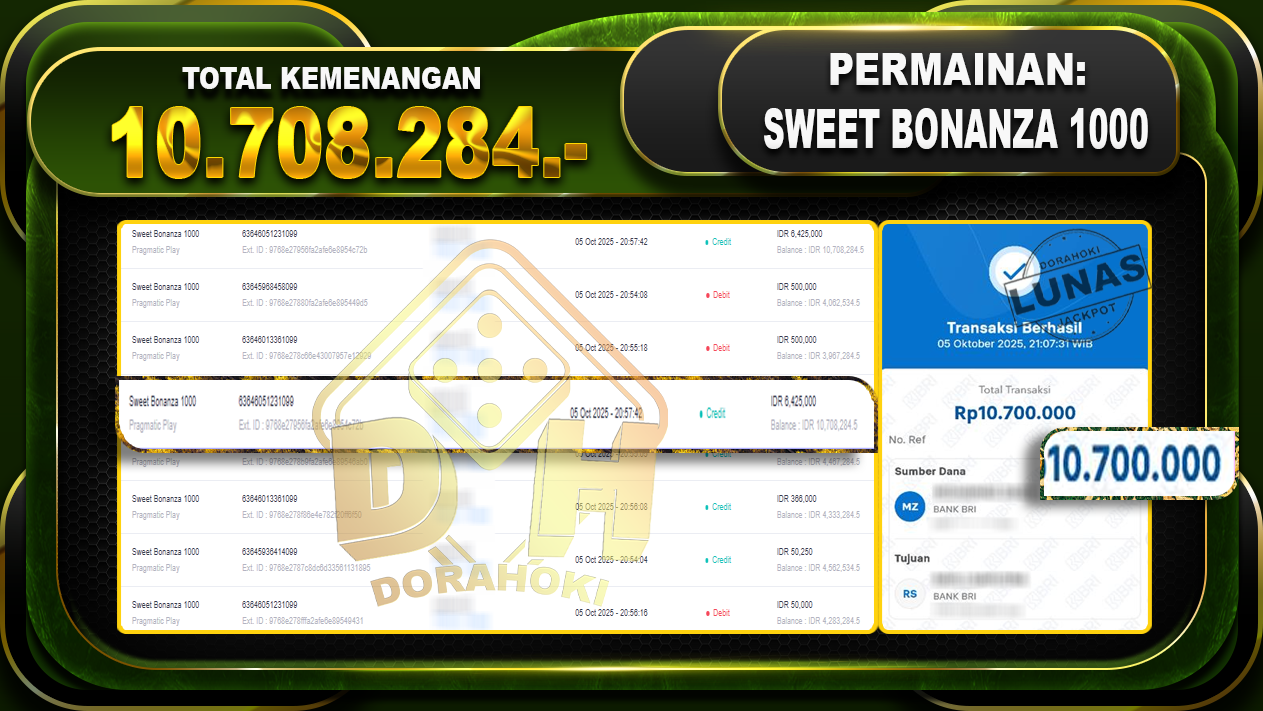 Bukti JP Sweet Bonanza 1000 – ucapkan selamat kepada user id praxxxxxx atas kemenangan di  Sweet Bonanza 1000 dengan total kemenangan Rp.10,708,284,- Yang pasti nya langsung LUNAS sesuai bukti ya bosku. Dorahoki nih bosku berapapun akan tetap kami bayar lunas ya bosku