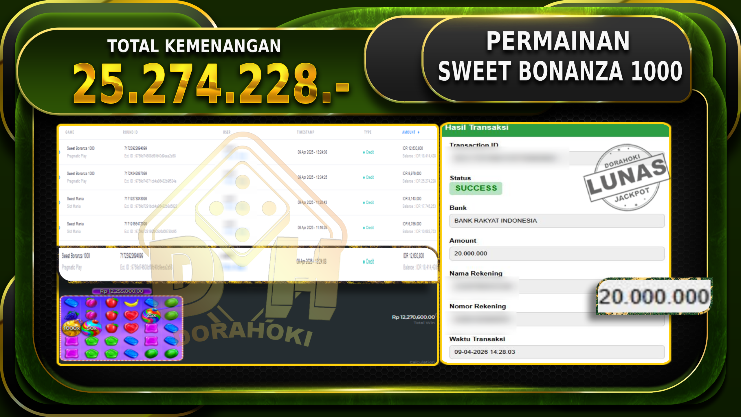 Bukti JP Sweet Bonanza 1000 – Selamat Kepada User ID : Kakxxx atas kemenangan Sweet Bonanza 1000 Dengan Nominal Sebesar Rp.25.274.228,- Yang pasti nya langsung LUNAS Sesuai Bukti.