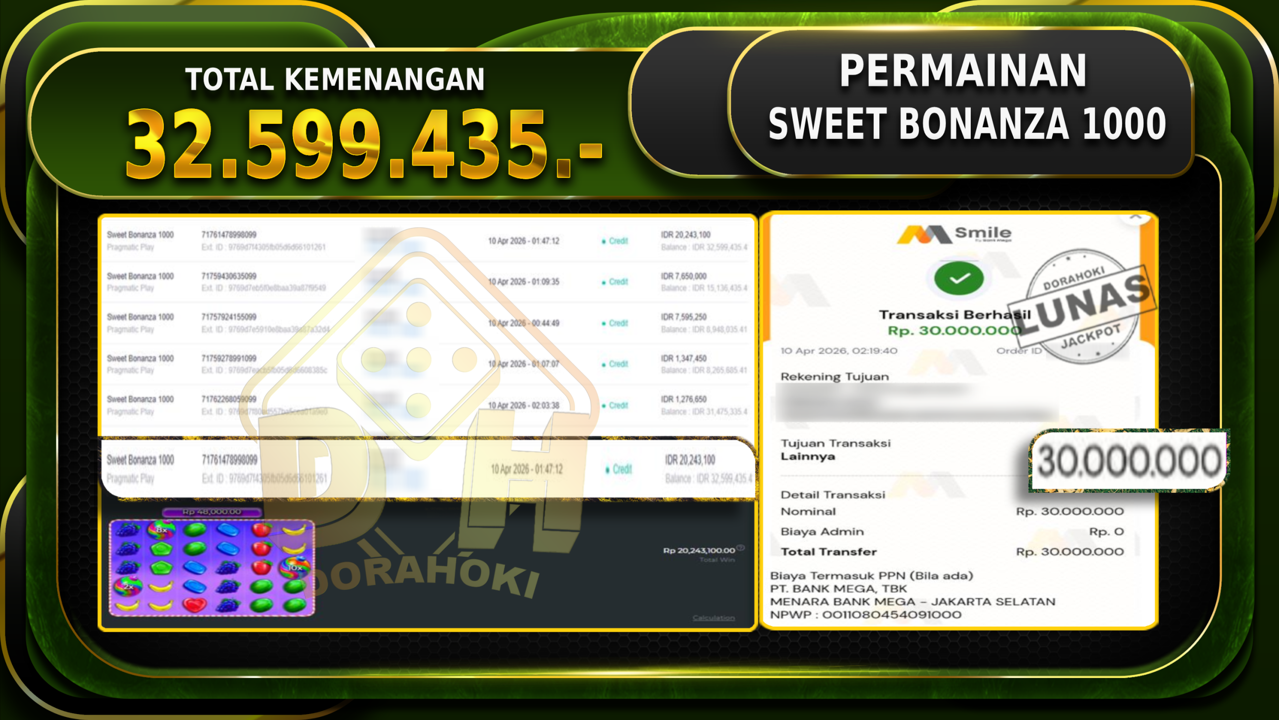 Bukti JP Sweet Bonanza 1000 – Selamat Kepada User ID : Firxxx atas kemenangan Sweet Bonanza 1000 Dengan Nominal Sebesar Rp.32.599.435,- Yang pasti nya langsung LUNAS Sesuai Bukti.