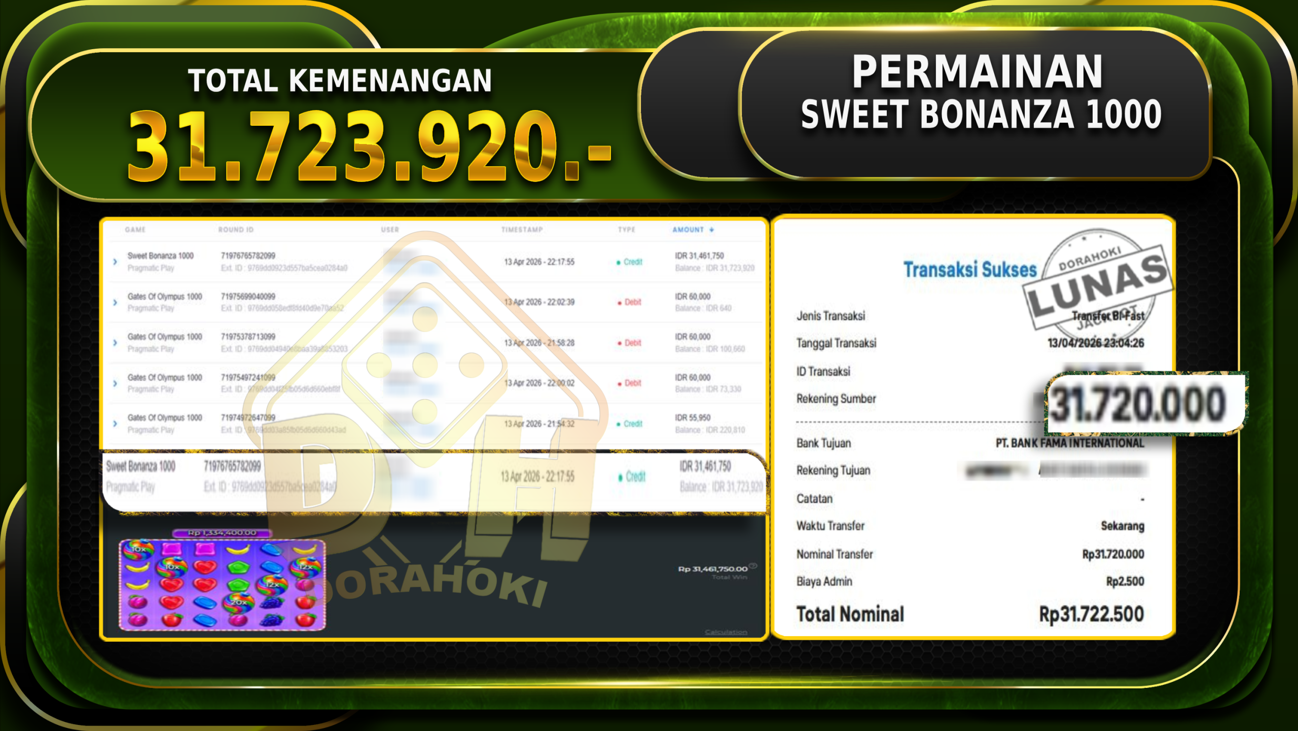 Bukti JP Sweet Bonanza 1000 – Selamat Kepada User ID : Colxxx atas kemenangan Sweet Bonanza 1000 Dengan Nominal Sebesar Rp.31.723.920,- Yang pasti nya langsung LUNAS Sesuai Bukti.