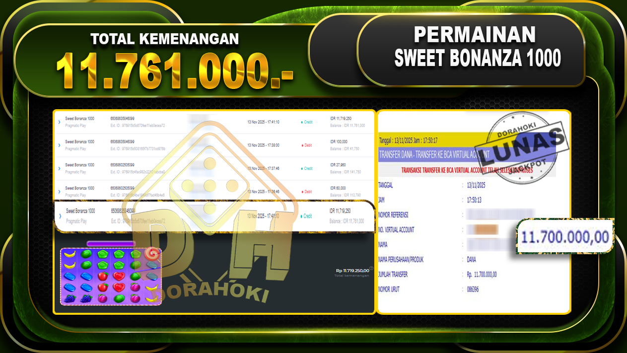 Bukti JP Sweet Bonanza 1000 – ucapkan selamat kepada user id kasxxxxx atas kemenangan di Sweet Bonanza 1000 dengan total kemenangan Rp.11.761.000,- Yang pasti nya langsung LUNAS sesuai bukti ya bosku. Dorahoki nih bosku berapapun akan tetap kami bayar lunas ya bosku.