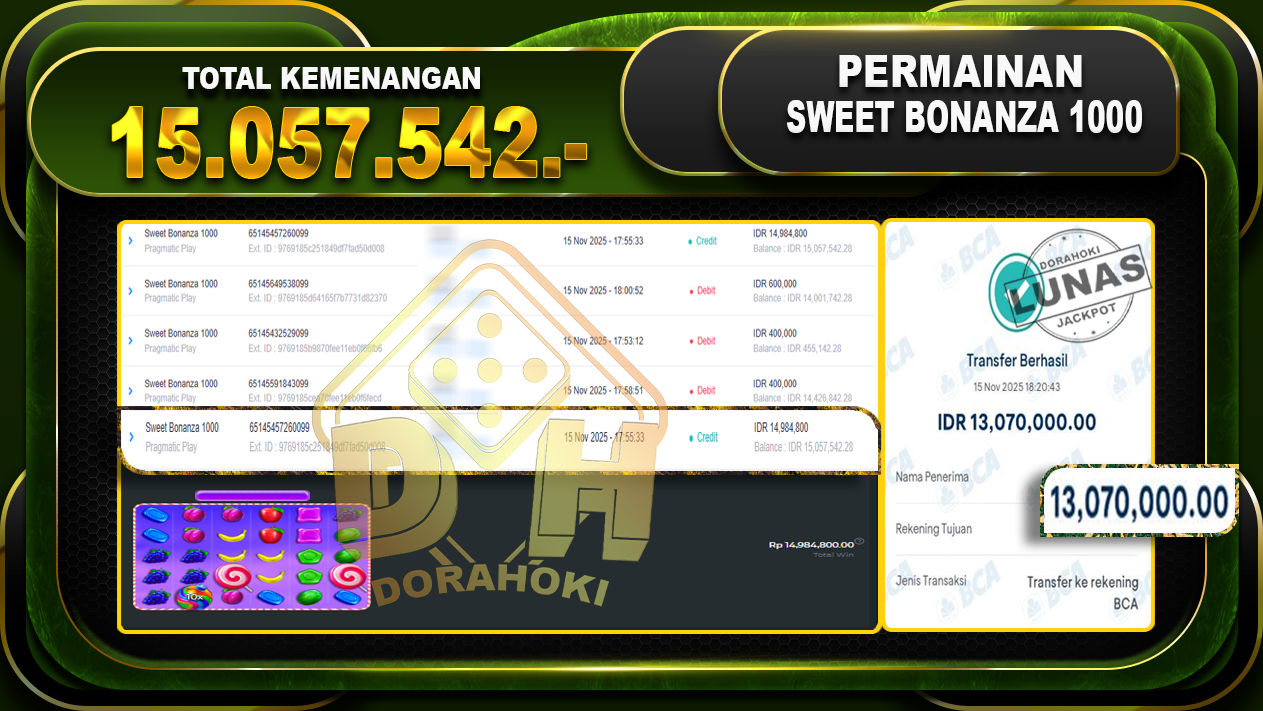 Bukti JP Sweet Bonanza 1000 – ucapkan selamat kepada user id samxxx atas kemenangan di Sweet Bonanza 1000 dengan total kemenangan Rp.15.057.542,- Yang pasti nya langsung LUNAS sesuai bukti ya bosku. Dorahoki nih bosku berapapun akan tetap kami bayar lunas ya bosku.