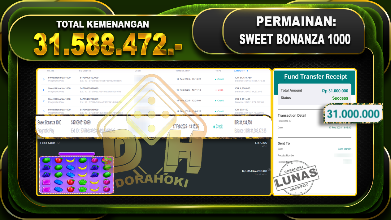Bukti JP SWEET BONANZA 1000 – ucapkan selamat kepada user id WONGSUSAHxxx atas kemenangan di  SWEET BONANZA 1000 dengan total kemenangan Rp.31.588.472,- . Yang pasti nya langsung LUNAS sesuai bukti ya bosku. Dorahoki nih bosku berapapun akan tetap kami bayar lunas ya bosku.