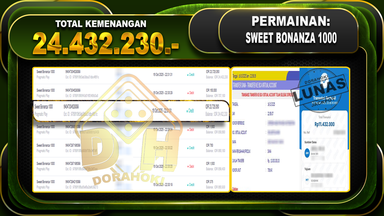 Bukti JP Sweet Bonanza 1000 – ucapkan selamat kepada user id panxxxxx atas kemenangan di Sweet Bonanza 1000 dengan total kemenangan Rp.24.432.230,- Yang pasti nya langsung LUNAS sesuai bukti ya bosku. Dorahoki nih bosku berapapun akan tetap kami bayar lunas ya bosku.