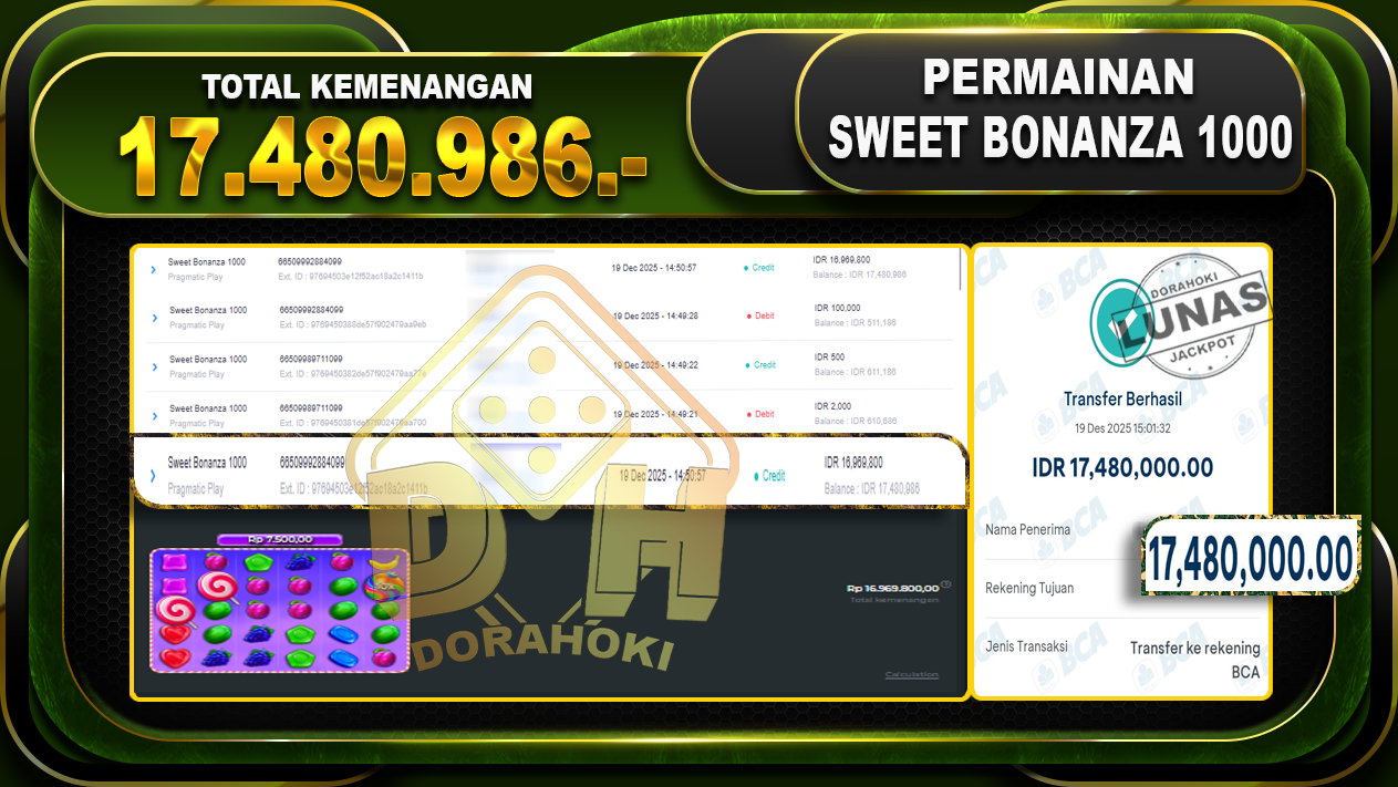 Bukti JP Sweet Bonanza 1000 – ucapkan selamat kepada user id pamxxxxx atas kemenangan di  Sweet Bonanza 1000 dengan total kemenangan Rp.17.480.986,- Yang pasti nya langsung LUNAS sesuai bukti ya bosku. Dorahoki nih bosku berapapun akan tetap kami bayar lunas ya bosku.