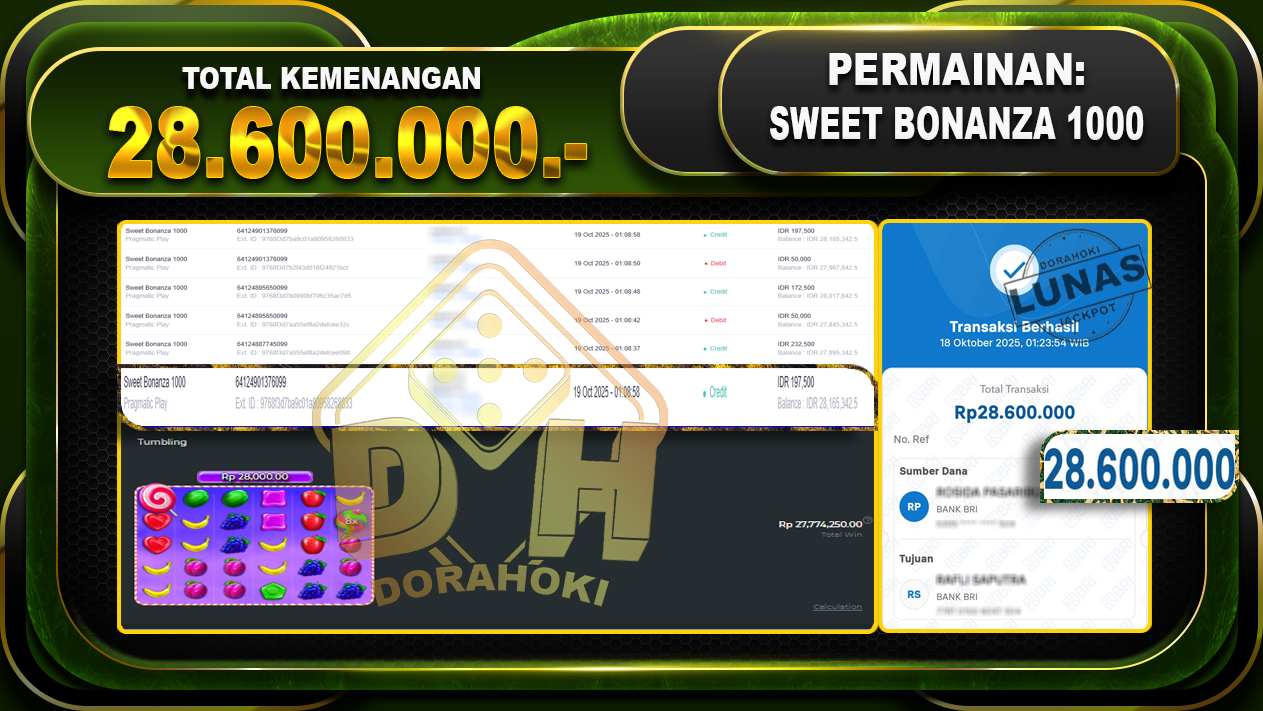 Bukti JP Sweet Bonanza 1000 – ucapkan selamat kepada user id praxxxxx atas kemenangan di Sweet Bonanza 1000 dengan total kemenangan Rp.28.600.000,- Yang pasti nya langsung LUNAS sesuai bukti ya bosku. Dorahoki nih bosku berapapun akan tetap kami bayar lunas ya bosku.