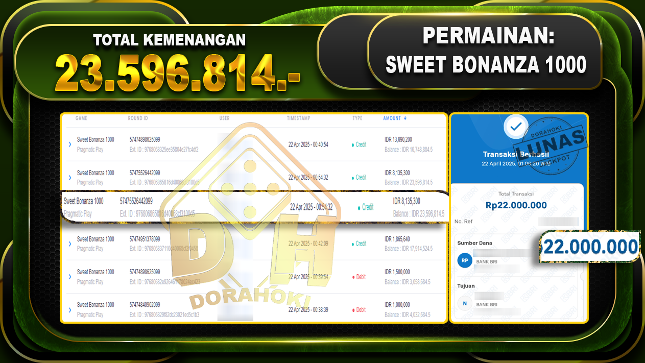 Bukti JP SWEET BONANZA 1000 – ucapkan selamat kepada user id Unnxxx atas kemenangan di SWEET BONANZA 1000 dengan total kemenangan Rp 23.596.814,- . Yang pasti nya langsung LUNAS sesuai bukti ya bosku. Dorahoki nih bosku berapapun akan tetap kami bayar lunas ya bosku.