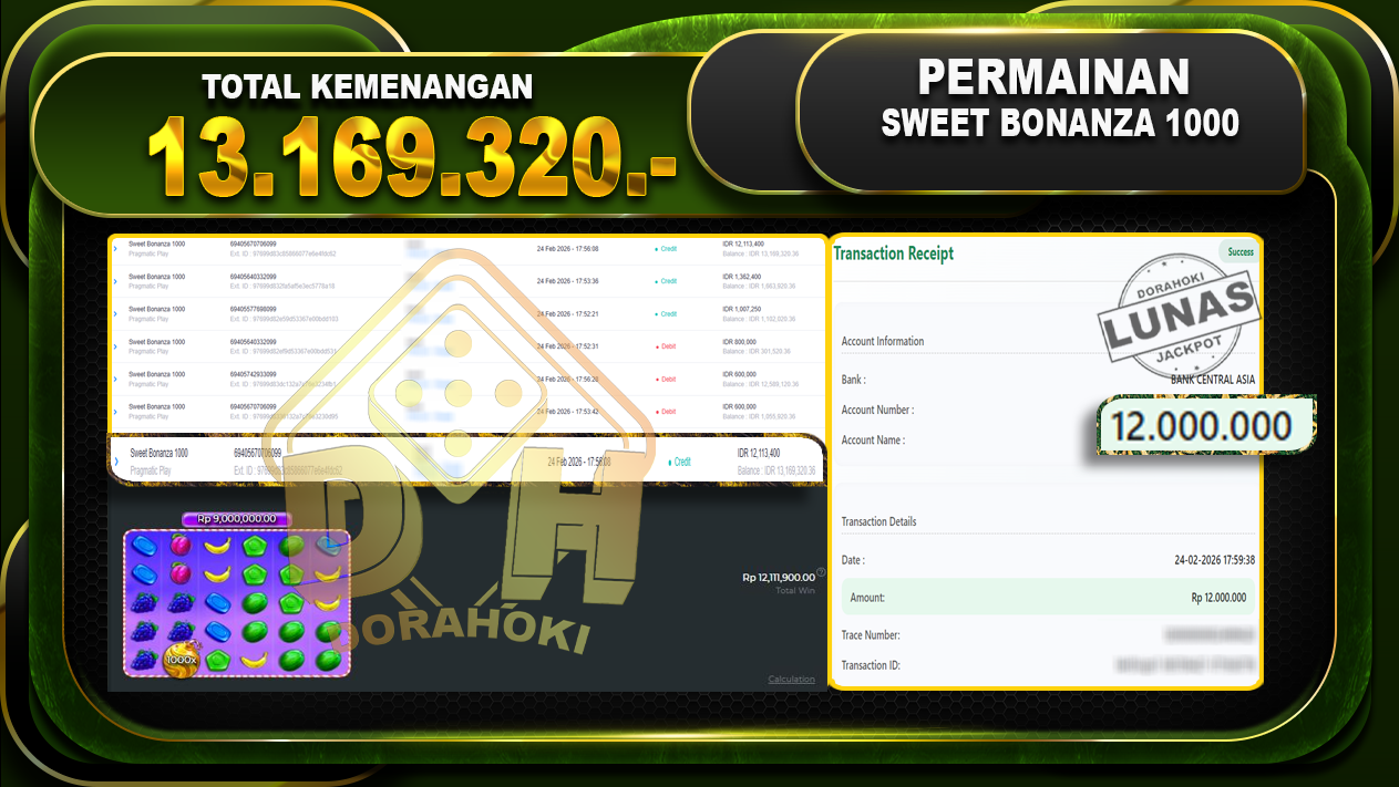 Bukti JP Sweet Bonanza 1000 – Selamat Kepada User ID : Bawxxx atas kemenangan Sweet Bonanza 1000 Dengan Nominal Sebesar Rp 13.169.320,- . Yang pasti nya langsung LUNAS Sesuai Bukti.