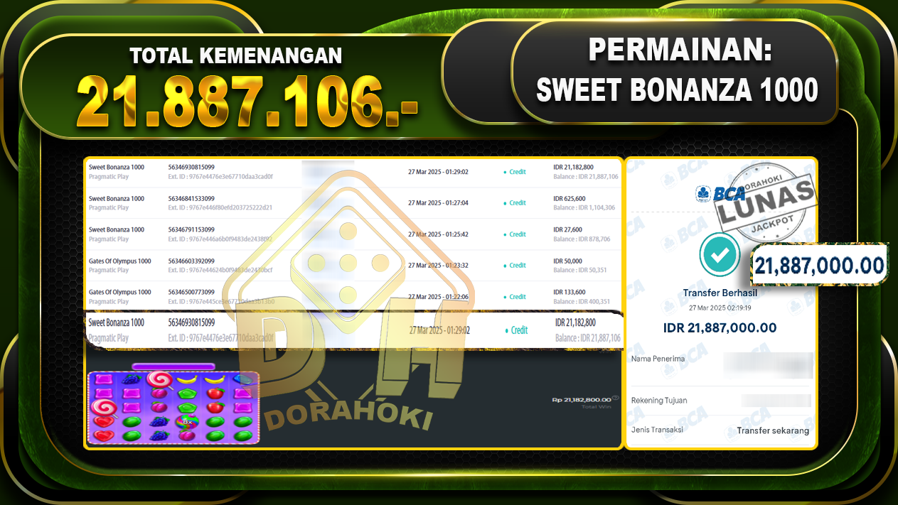 Bukti JP SWEET BONANZA 1000 – ucapkan selamat kepada user id Iodxxx atas kemenangan di SWEET BONANZA 1000 dengan total kemenangan Rp21.887.106,- . Yang pasti nya langsung LUNAS sesuai bukti ya bosku. Dorahoki nih bosku berapapun akan tetap kami bayar lunas ya bosku.