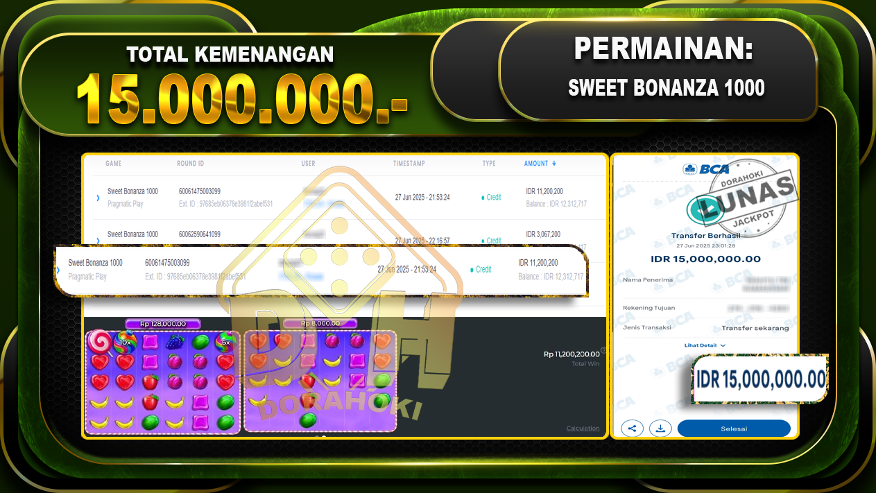 Bukti JP SWEET BONANZA 1000 – ucapkan selamat kepada user id BICxxx atas kemenangan di SWEET BONANZA 1000 dengan total kemenangan Rp.15.000.000,- . Yang pasti nya langsung LUNAS sesuai bukti ya bosku. Dorahoki nih bosku berapapun akan tetap kami bayar lunas ya bosku.
