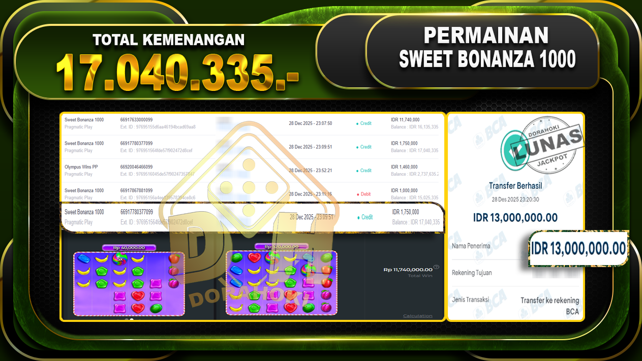 Bukti JP Sweet Bonanza 1000 – ucapkan selamat kepada user id samxxx atas kemenangan di Sweet Bonanza 1000 dengan total kemenangan Rp.17.040.335,- Yang pasti nya langsung LUNAS sesuai bukti ya bosku. Dorahoki nih bosku berapapun akan tetap kami bayar lunas ya bosku.