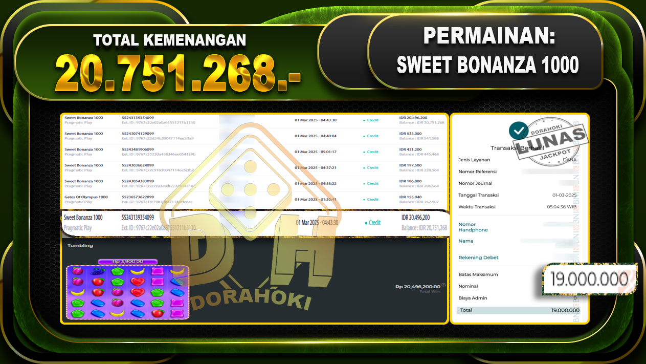Bukti JP SWEET BONANZA 1000 – ucapkan selamat kepada user id Bwsxxx atas kemenangan di SWEET BONANZA 1000 dengan total kemenangan Rp.20.751.268,- . Yang pasti nya langsung LUNAS sesuai bukti ya bosku. Dorahoki nih bosku berapapun akan tetap kami bayar lunas ya bosku.
