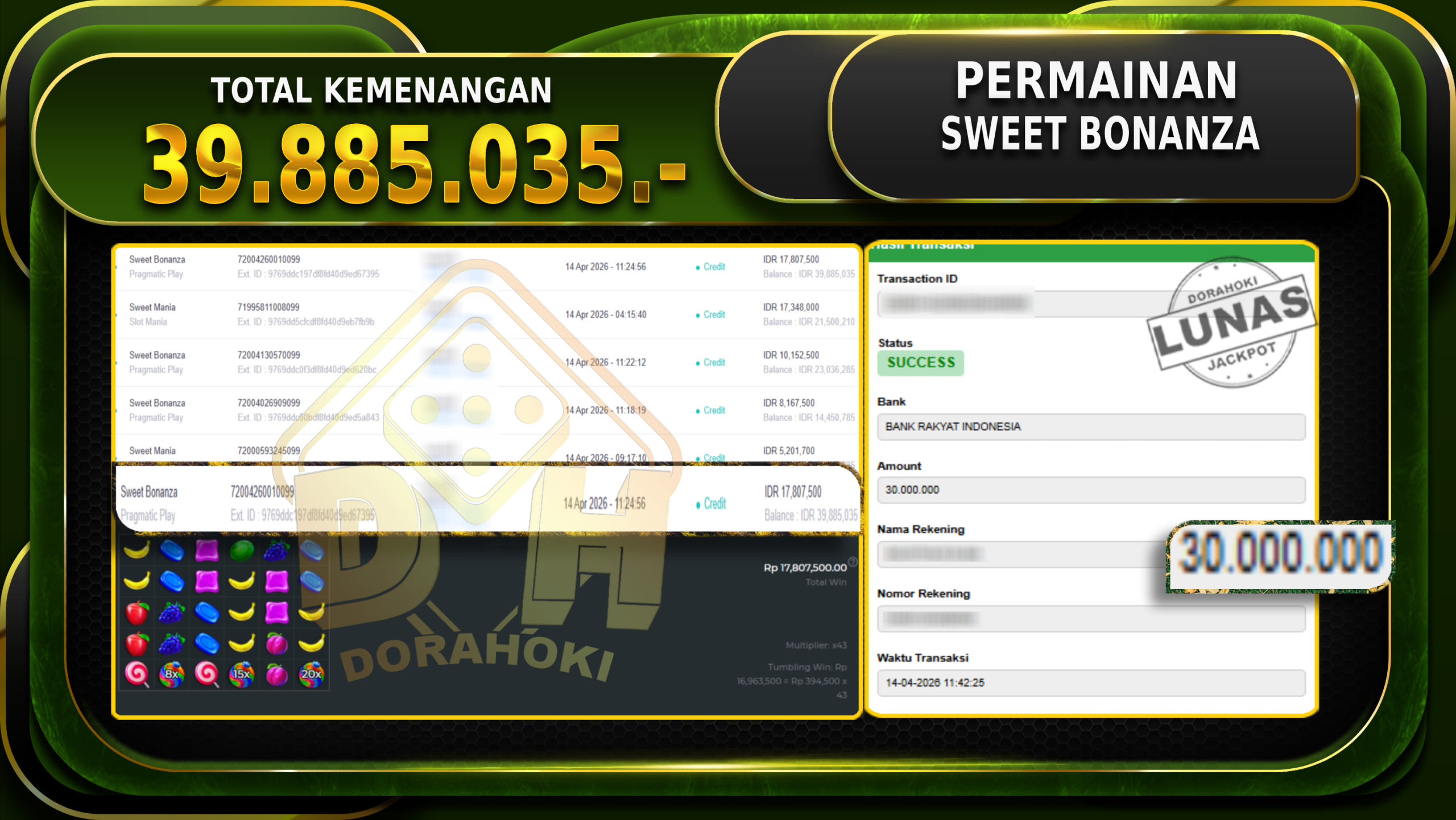 Bukti JP Sweet Bonanza – Selamat Kepada User ID : Kakxxx atas kemenangan Sweet Bonanza Dengan Nominal Sebesar Rp.39.885.035,- Yang pasti nya langsung LUNAS Sesuai Bukti.