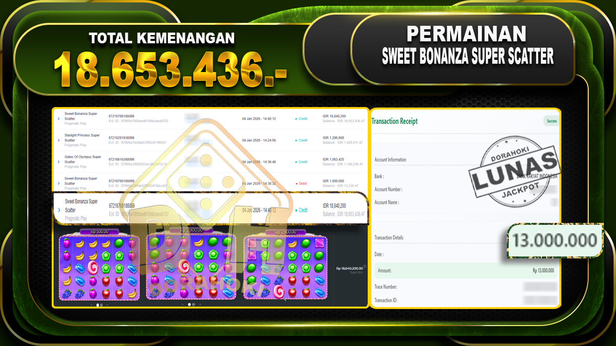 Bukti JP Sweet Bonanza Super Scatter – ucapkan selamat kepada user id jawxxxxx atas kemenangan di Sweet Bonanza Super Scatter dengan total kemenangan Rp.18,653,436,- Yang pasti nya langsung LUNAS sesuai bukti ya bosku. Dorahoki nih bosku berapapun akan tetap kami bayar lunas ya bosku