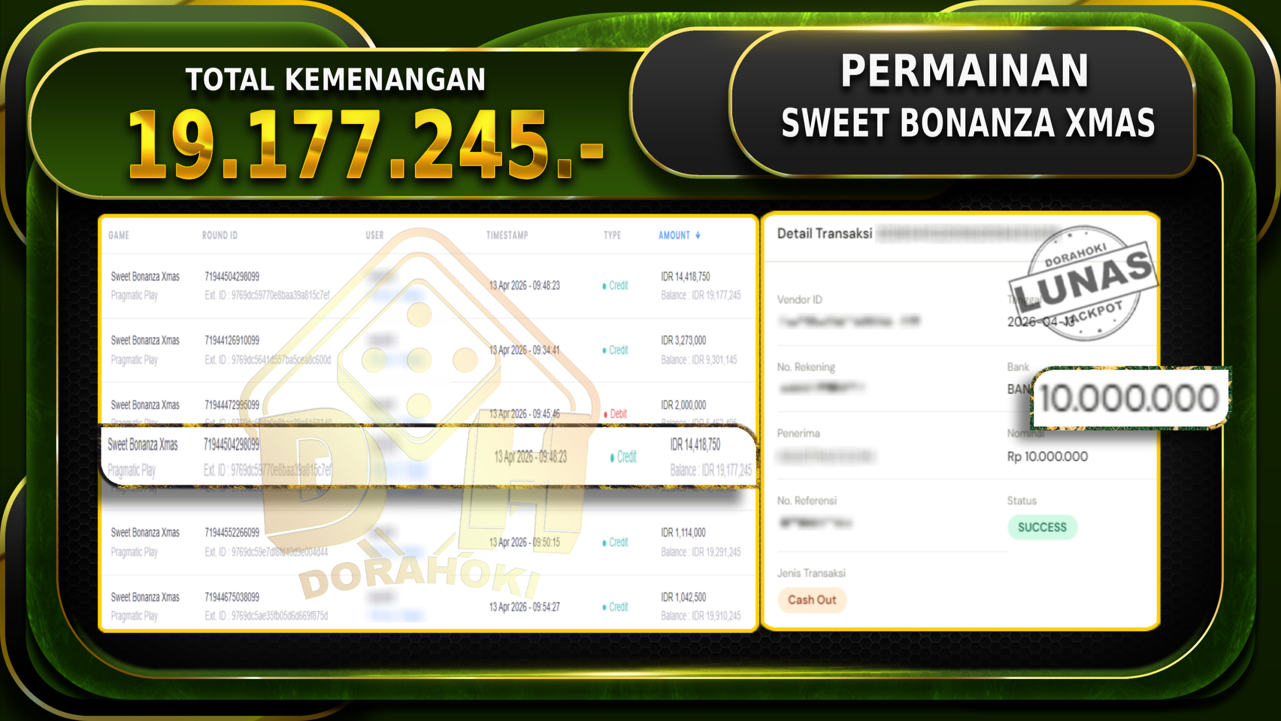 Bukti JP Sweet Bonanza Xmas – Selamat Kepada User ID : Kakxxxx atas kemenangan Sweet Bonanza Xmas Dengan Nominal Sebesar Rp.19.177.245,- . Yang pasti nya langsung LUNAS Sesuai Bukti.