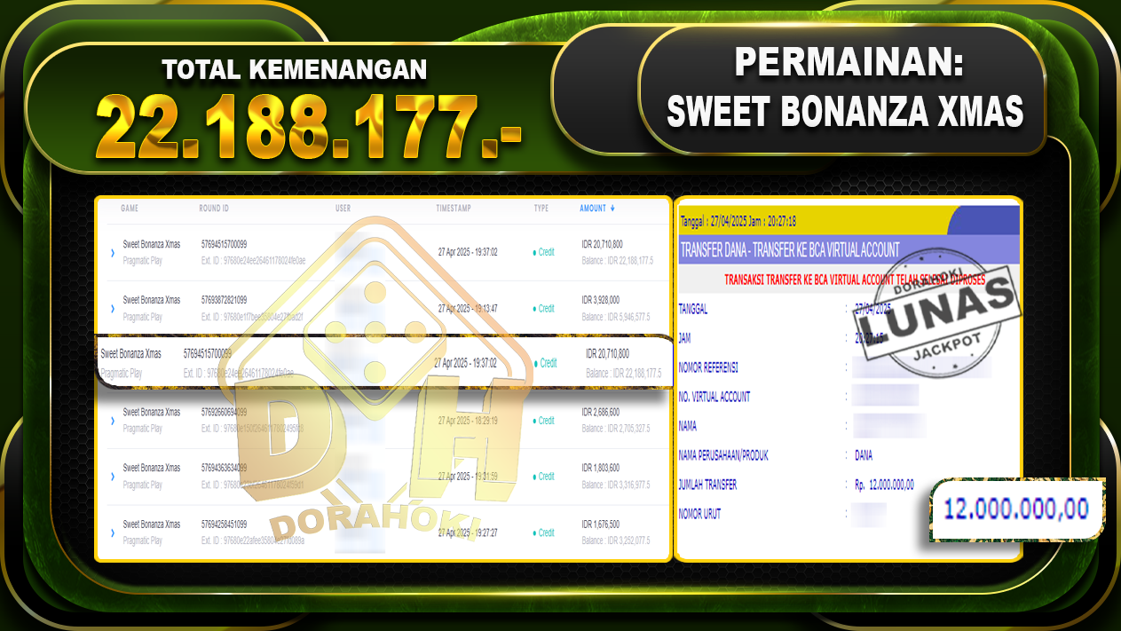 Bukti JP Sweet Bonanza Xmas – ucapkan selamat kepada user id Supxxx atas kemenangan di Sweet Bonanza Xmas dengan total kemenangan Rp.22.188.177,- . Yang pasti nya langsung LUNAS sesuai bukti ya bosku. Dorahoki nih bosku berapapun akan tetap kami bayar lunas ya bosku.