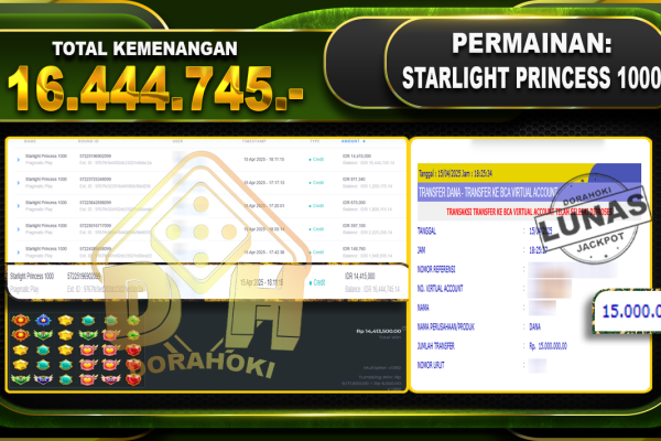 Bukti JP STARLIGHT PRINCESS 1000 – ucapkan selamat kepada user id Tanxxx atas kemenangan di  STARLIGHT PRINCESS 1000  dengan total kemenangan Rp.16,444.745,- . Yang pasti nya langsung LUNAS sesuai bukti ya bosku. Dorahoki nih bosku berapapun akan tetap kami bayar lunas ya bosku Kami mengucapkan Terima Kasih telah mempercayakan DORAHOKI sebagai Bandar Online pilihan dalam bermain…