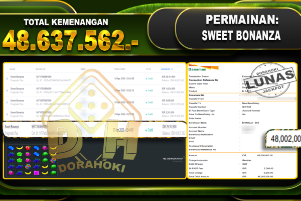 Bukti JP SWEET BONANZA – ucapkan selamat kepada user id Iopxxx atas kemenangan di SWEET BONANZA dengan total kemenangan Rp48.637.362,- . Yang pasti nya langsung LUNAS sesuai bukti ya bosku. Dorahoki nih bosku berapapun akan tetap kami bayar lunas ya bosku. Kami mengucapkan Terima Kasih telah mempercayakan DORAHOKI sebagai Bandar Online pilihan dalam bermain judi…