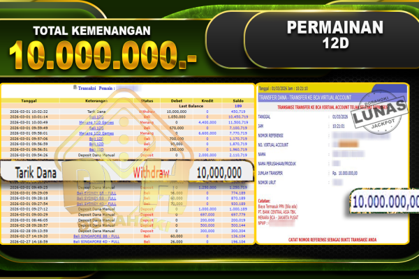 Bukti JP 12D Games – ucapkan selamat kepada user id Ahmxxxx atas kemenangan di 12D Games dengan total kemenangan Rp.10.000.000,- Yang pasti nya langsung LUNAS Sesuai Bukti. Kemenangan Berapapun Situs DoraHoki Akan Membayar Lunas ya