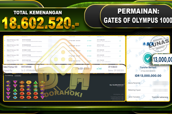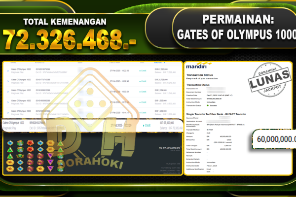 Bukti JP GATES OF OLYMPUS 1000 – ucapkan selamat kepada user id PRIxxx atas kemenangan di GATES OF OLYMPUS 1000 dengan total kemenangan Rp.72.326.468,- . Yang pasti nya langsung LUNAS sesuai bukti ya bosku. Dorahoki nih bosku berapapun akan tetap kami bayar lunas ya bosku. Kami mengucapkan Terima Kasih telah mempercayakan DORAHOKI sebagai Bandar Online pilihan…