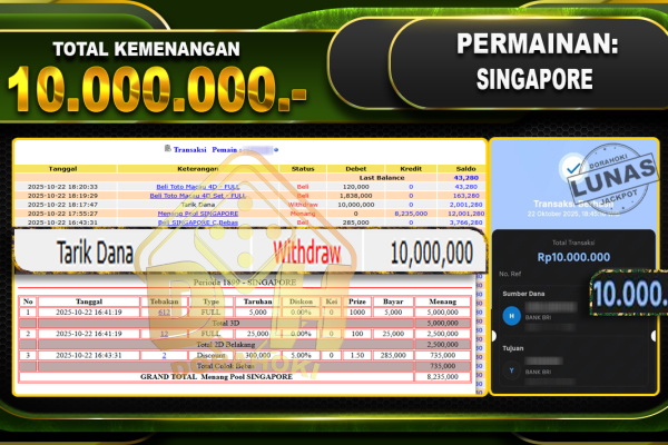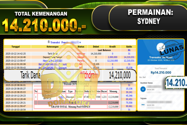 Bukti JP TOGEL SYDNEY – ucapkan selamat kepada user id phlxxx atas kemenangan di TOGEL SYDNEY dengan total kemenangan Rp.14,210,000,- Yang pasti nya langsung LUNAS sesuai bukti ya bosku. Dorahoki nih bosku berapapun akan tetap kami bayar lunas ya bosku