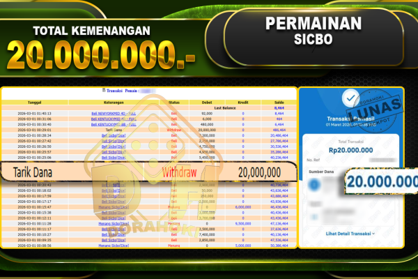 Bukti JP Sicbo Dice – Selamat Kepada User ID : Cunxxxx atas kemenangan Sicbo Dice Dengan Nominal Sebesar Rp.20.000.000,- Yang pasti nya langsung LUNAS Sesuai Bukti. Kemenangan Berapapun Situs DoraHoki Akan Membayar Lunas ya