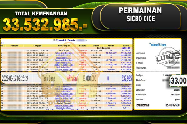 Bukti JP Sicbo Dice – Selamat Kepada User ID : Subxxxx atas kemenangan Sicbo Dice Dengan Nominal Sebesar Rp.33.532.985,- Yang pasti nya langsung LUNAS Sesuai Bukti. Kemenangan Berapapun Situs DoraHoki Akan Membayar Lunas ya