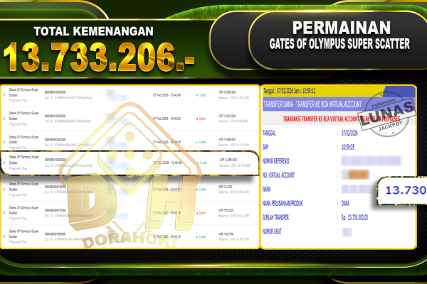 Bukti JP Gates Of Olympus Super Scatter – Selamat Kepada user ID : jenxxxxx  atas kemenangan Gates Of Olympus Super Scatter Dengan Nominal Sebesar Rp.13.733.206,- Yang pasti nya langsung LUNAS Sesuai Bukti. Kemenangan Berapapun Situs DoraHoki Akan Membayar Lunas yah