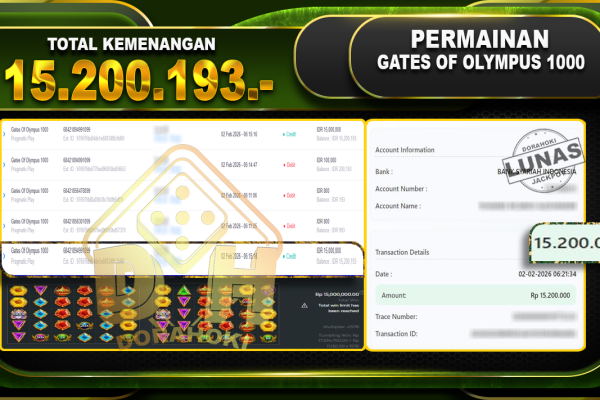 Bukti JP Gates Of Olympus 1000 – Selamat Kepada User ID : ricxxx atas kemenangan Gates Of Olympus 1000 Dengan Nominal Sebesar Rp 15.200.193,- . Yang pasti nya langsung LUNAS Sesuai Bukti. Kemenangan Berapapun Situs DoraHoki Akan Membayar Lunas yah Kami mengucapkan Terima Kasih telah mempercayakan DORAHOKI sebagai Bandar Online pilihan dalam bermain judi online….