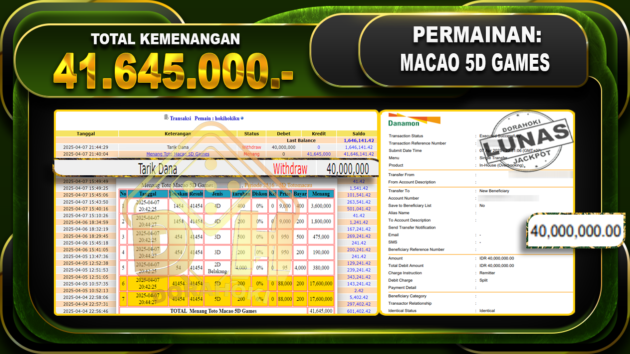 Bukti JP TOGEL 5D TOTOMACAU – ucapkan selamat kepada user id Hokxxx atas kemenangan di TOGEL 5D TOTOMACAU dengan total kemenangan Rp.41.645.000,- . Yang pasti nya langsung LUNAS sesuai bukti ya bosku. Dorahoki nih bosku berapapun akan tetap kami bayar lunas ya bosku.