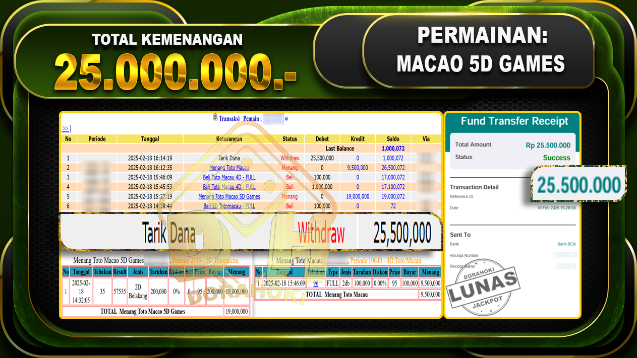 Bukti JP TOGEL 5D TOTOMACAU – ucapkan selamat kepada user id alex12xxx atas kemenangan di TOGEL 5D TOTOMACAU dengan total kemenangan Rp.25.000.000,- . Yang pasti nya langsung LUNAS sesuai bukti ya bosku. Dorahoki nih bosku berapapun akan tetap kami bayar lunas ya bosku.