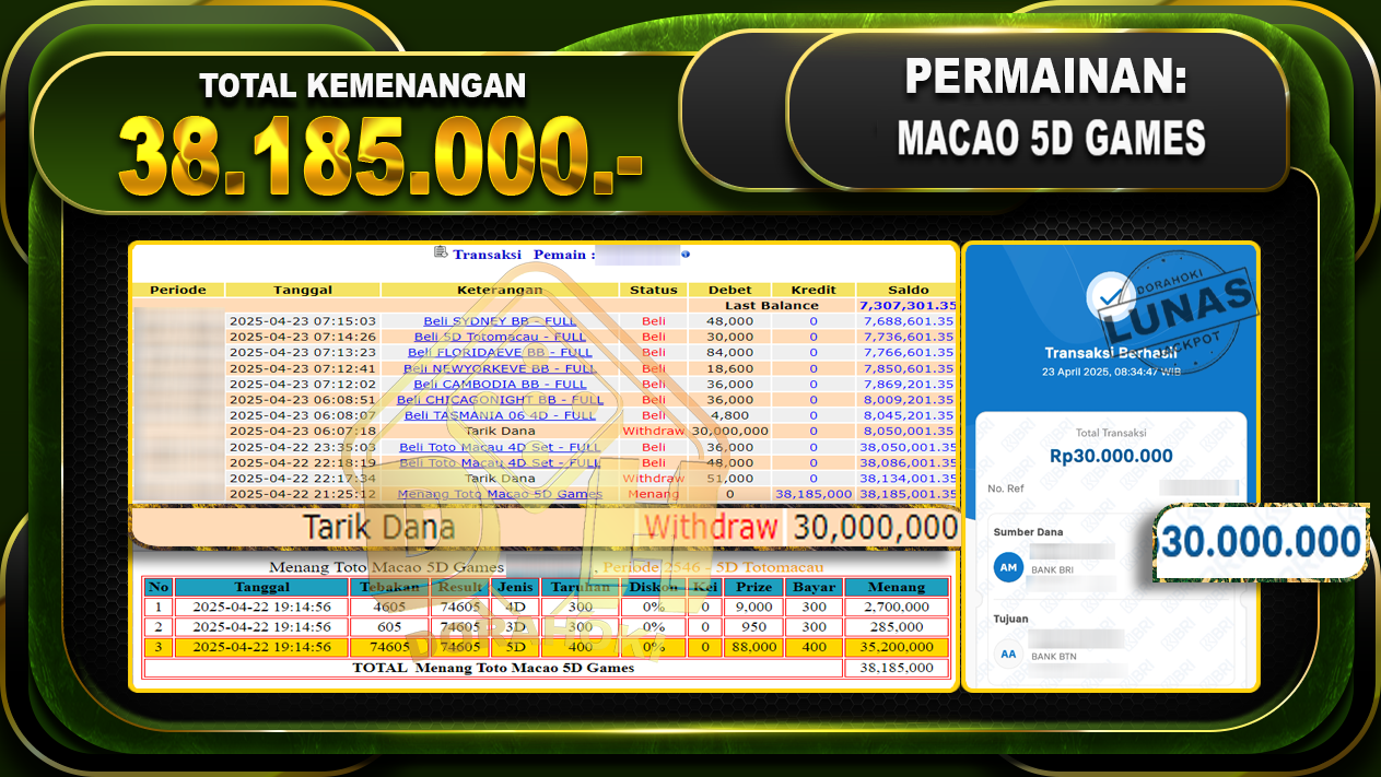 Bukti JP TOGEL 5D TOTOMACAU – ucapkan selamat kepada user id Jagxxx atas kemenangan di TOGEL 5D TOTOMACAU dengan total kemenangan Rp.38.185.000,- . Yang pasti nya langsung LUNAS sesuai bukti ya bosku. Dorahoki nih bosku berapapun akan tetap kami bayar lunas ya bosku.