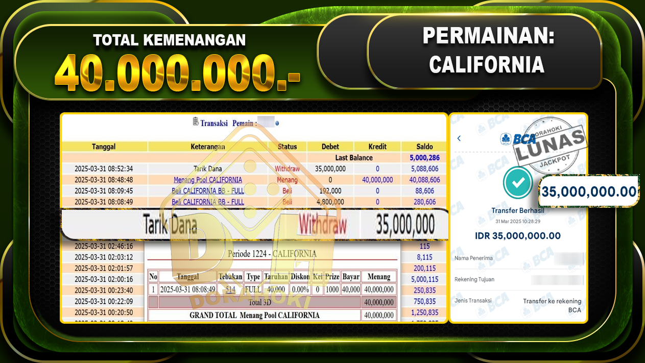 Bukti JP TOGEL CALIFORNIA – ucapkan selamat kepada user id Busxxx atas kemenangan di TOGEL CALIFORNIA dengan total kemenangan Rp.40.000.000,- . Yang pasti nya langsung LUNAS sesuai bukti ya bosku. Dorahoki nih bosku berapapun akan tetap kami bayar lunas ya bosku.
