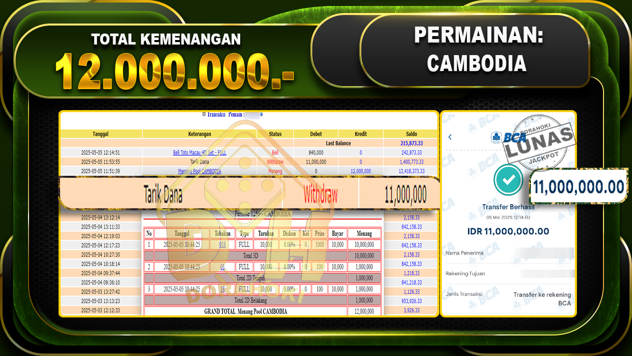 Bukti JP TOGEL CAMBODIA – ucapkan selamat kepada user id Harxxx atas kemenangan di TOGEL CAMBODIA dengan total kemenangan Rp 12.000.000.,- . Yang pasti nya langsung LUNAS sesuai bukti ya bosku. Dorahoki nih bosku berapapun akan tetap kami bayar lunas ya bosku.