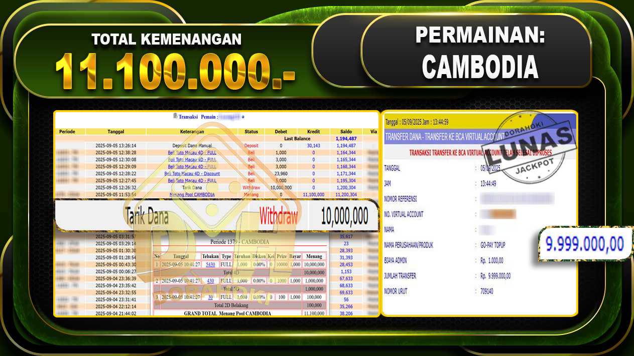Bukti JP TOGEL CAMBODIA – ucapkan selamat kepada user id Locxxxxxx atas kemenangan di TOGEL CAMBODIA dengan total kemenangan Rp.11,100,000,- Yang pasti nya langsung LUNAS sesuai bukti ya bosku. Dorahoki nih bosku berapapun akan tetap kami bayar lunas ya bosku