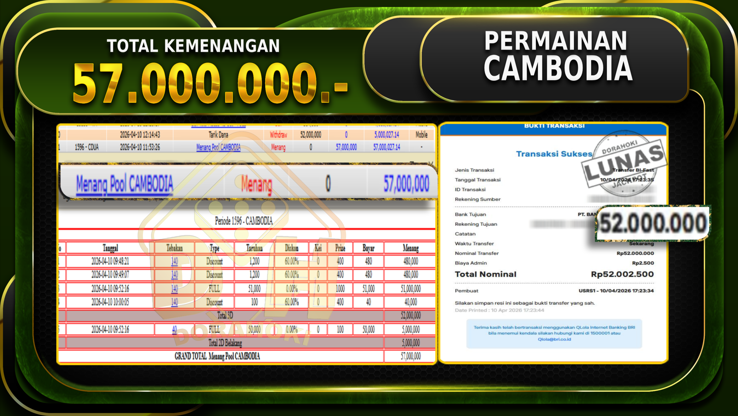 Bukti JP TOGEL CAMBODIA – Selamat Kepada User id Minxxx atas kemenangan TOGEL CAMBODIA Dengan Nominal Sebesar Rp.57.000.000,- Yang pasti nya langsung LUNAS Sesuai Bukti.