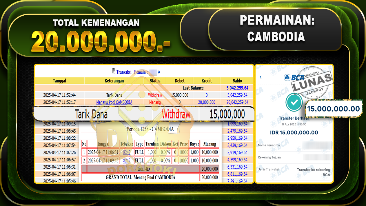 Bukti JP TOGEL CAMBODIA – ucapkan selamat kepada user id Gapxxx atas kemenangan di TOGEL CAMBODIA dengan total kemenangan Rp 20.000.000.,- . Yang pasti nya langsung LUNAS sesuai bukti ya bosku. Dorahoki nih bosku berapapun akan tetap kami bayar lunas ya bosku.