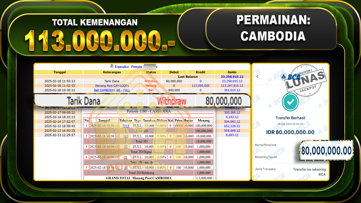 Bukti JP TOGEL CAMBODIA – ucapkan selamat kepada user id yatxxx atas kemenangan di  TOGEL CAMBODIA dengan total kemenangan Rp.113.000.000,- . Yang pasti nya langsung LUNAS sesuai bukti ya bosku. Dorahoki nih bosku berapapun akan tetap kami bayar lunas ya bosku.