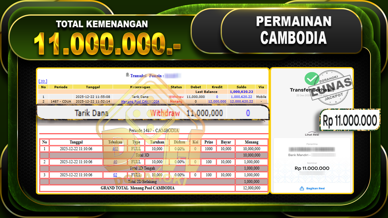 Bukti JP TOGEL CAMBODIA – ucapkan selamat kepada user id harxxx atas kemenangan di TOGEL CAMBODIA dengan total kemenangan Rp.11.000.000,- Yang pasti nya langsung LUNAS sesuai bukti ya bosku. Dorahoki nih bosku berapapun akan tetap kami bayar lunas ya bosku