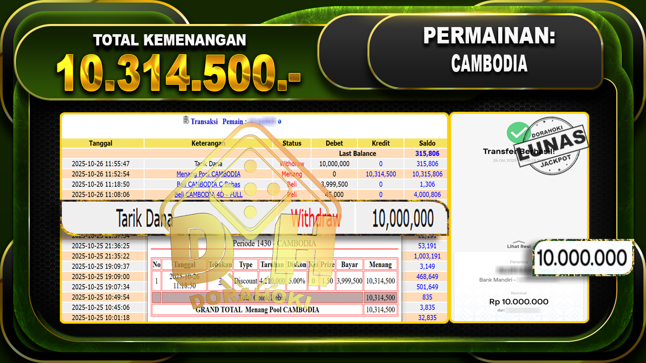 Bukti JP TOGEL CAMBODIA – ucapkan selamat kepada user id rivxxxxxx atas kemenangan di TOGEL CAMBODIA dengan total kemenangan Rp.10,314,500,- Yang pasti nya langsung LUNAS sesuai bukti ya bosku. Dorahoki nih bosku berapapun akan tetap kami bayar lunas ya bosku