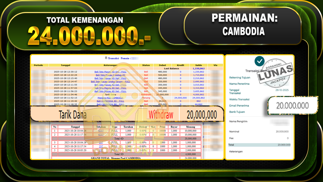Bukti JP TOGEL CAMBODIA- Yang kami berikan ini sah dan real tanpa di rekayasa bosku dan hanya bertujuan untuk meningkatkan kepercayaan member kami dan memberikan kenyamanan saat bermain jadi bosku tidak perlu khawatir MENANG BERAPAPUN PASTI KAMI BAYAR LUNAS!!