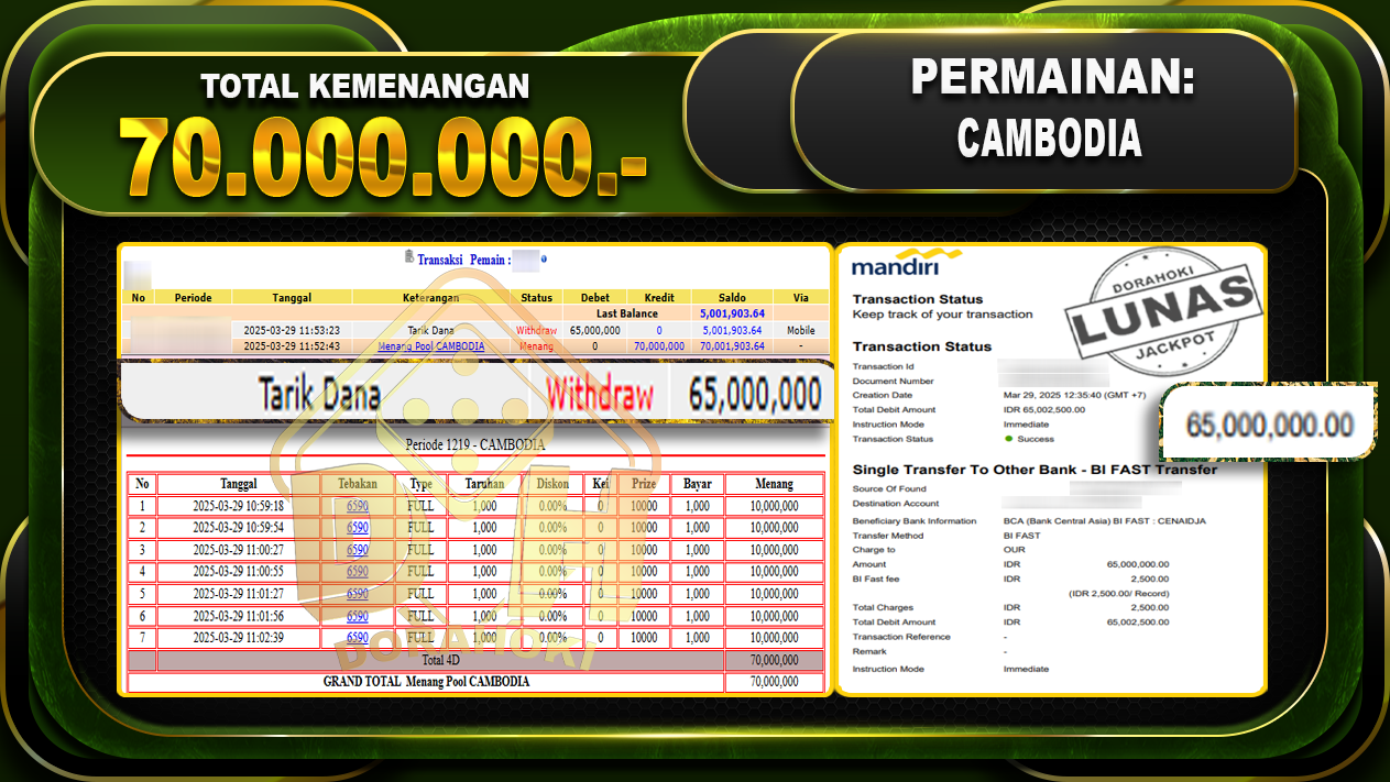 Bukti JP TOGEL CAMBODIA – ucapkan selamat kepada user id gapxxx atas kemenangan di TOGEL CAMBODIA dengan total kemenangan Rp.70.000.000,- . Yang pasti nya langsung LUNAS sesuai bukti ya bosku. Dorahoki nih bosku berapapun akan tetap kami bayar lunas ya bosku.