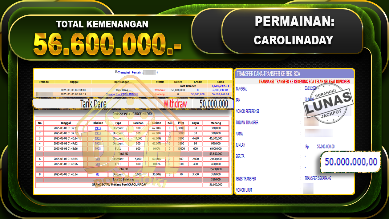 Bukti JP TOGEL CAROLINADAY – ucapkan selamat kepada user id Anjxxx atas kemenangan di TOGEL CAROLINADAY dengan total kemenangan Rp.56.600.000,- . Yang pasti nya langsung LUNAS sesuai bukti ya bosku. Dorahoki nih bosku berapapun akan tetap kami bayar lunas ya bosku.