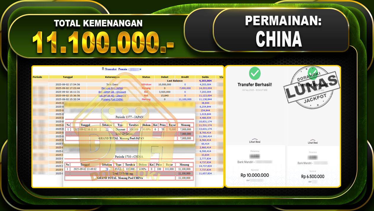 Bukti JP TOGEL CHINA – ucapkan selamat kepada user id Gulxxxx atas kemenangan di TOGEL CHINA dengan total kemenangan Rp.11.100.000,- Yang pasti nya langsung LUNAS sesuai bukti ya bosku. Dorahoki nih bosku berapapun akan tetap kami bayar lunas ya bosku