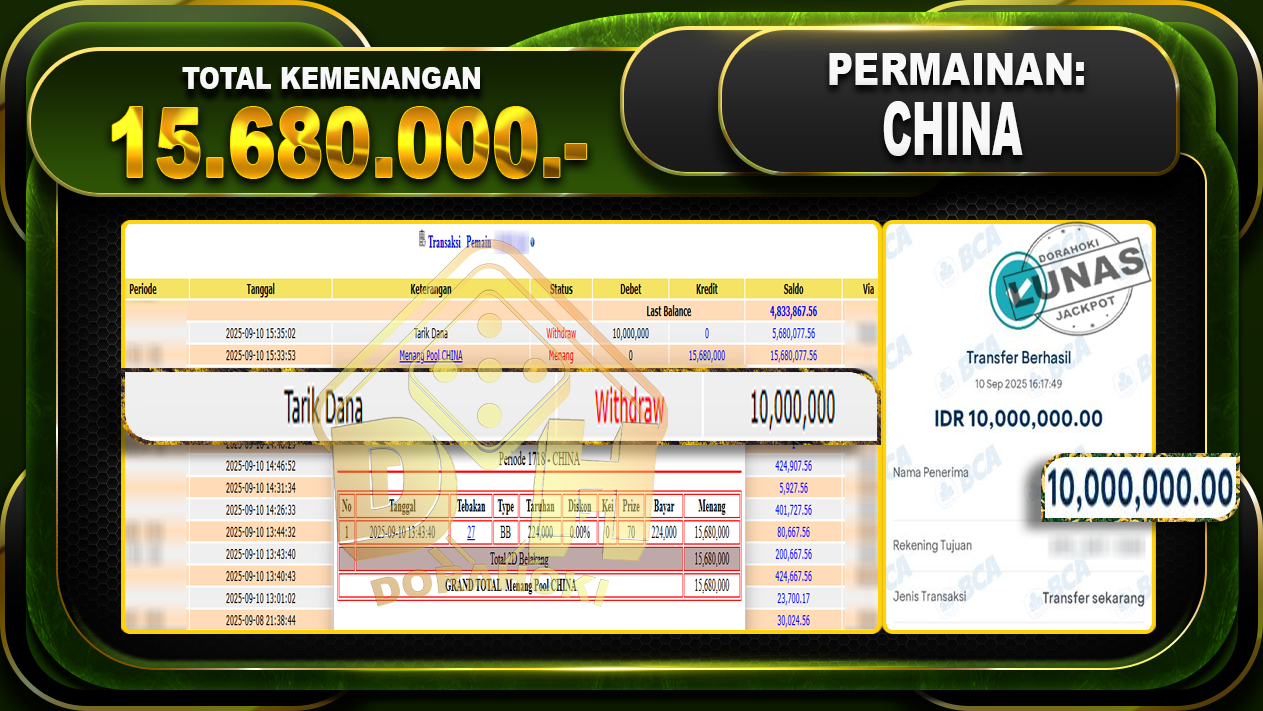 Bukti JP TOGEL CHINA – ucapkan selamat kepada user id Hoxxxxx atas kemenangan di TOGEL CHINA dengan total kemenangan Rp.15.680.000,- Yang pasti nya langsung LUNAS sesuai bukti ya bosku. Dorahoki nih bosku berapapun akan tetap kami bayar lunas ya bosku