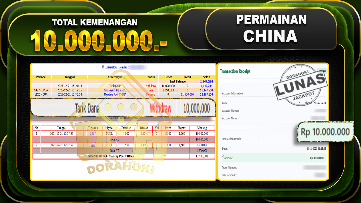Bukti JP TOGEL CHINA – ucapkan selamat kepada user id ridxxxxx atas kemenangan di TOGEL CHINA dengan total kemenangan Rp.10.000.000,- Yang pasti nya langsung LUNAS sesuai bukti ya bosku. Dorahoki nih bosku berapapun akan tetap kami bayar lunas ya bosku