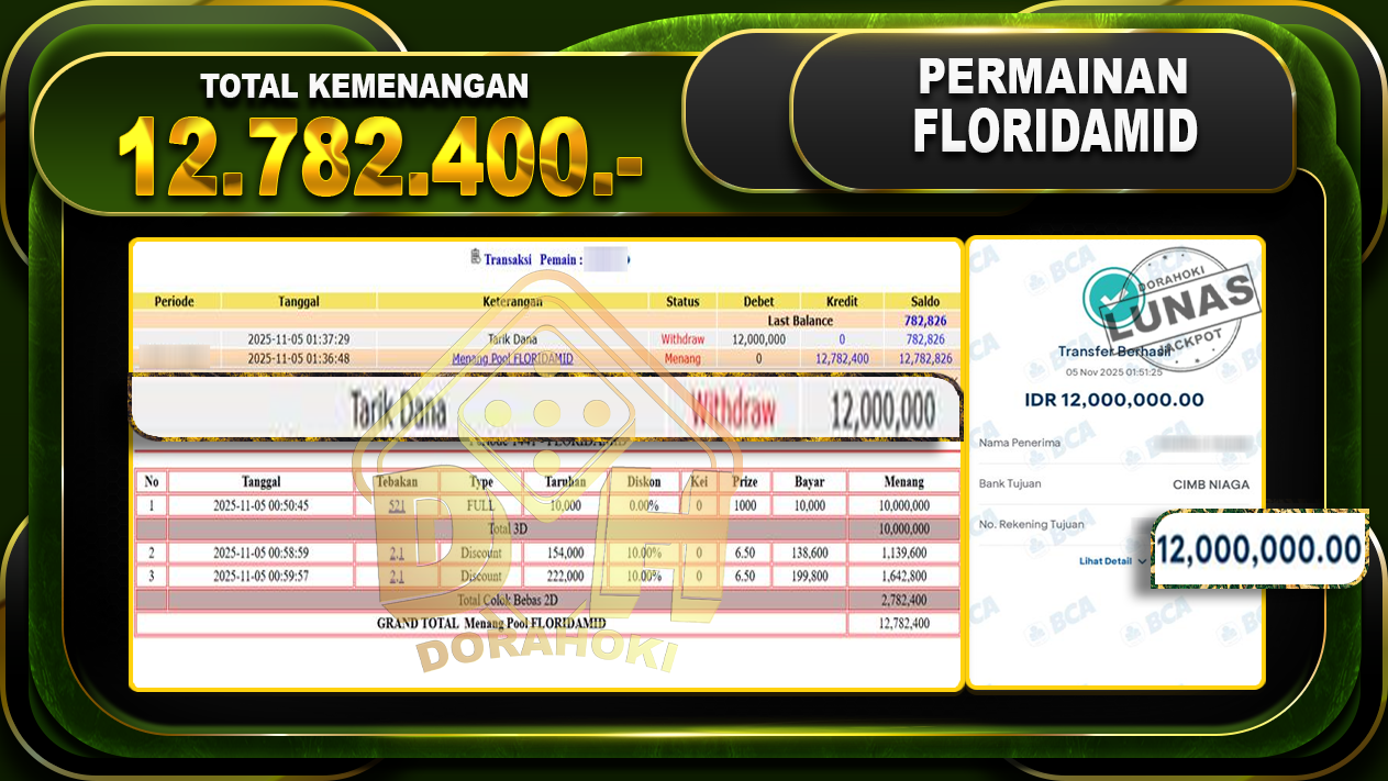 Bukti JP Togel FLORIDAMID – ucapkan selamat kepada user id alixxxx atas kemenangan di Togel FLORIDAMID dengan total kemenangan Rp.12.782.400,- . Yang pasti nya langsung LUNAS sesuai bukti ya bosku. Dorahoki nih bosku berapapun akan tetap kami bayar lunas ya bosku.
